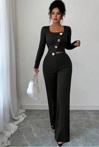 Kadın uzun kol kare yaka asimetrik düğme detay bluz ve yüksek bel pantolon ikili takım